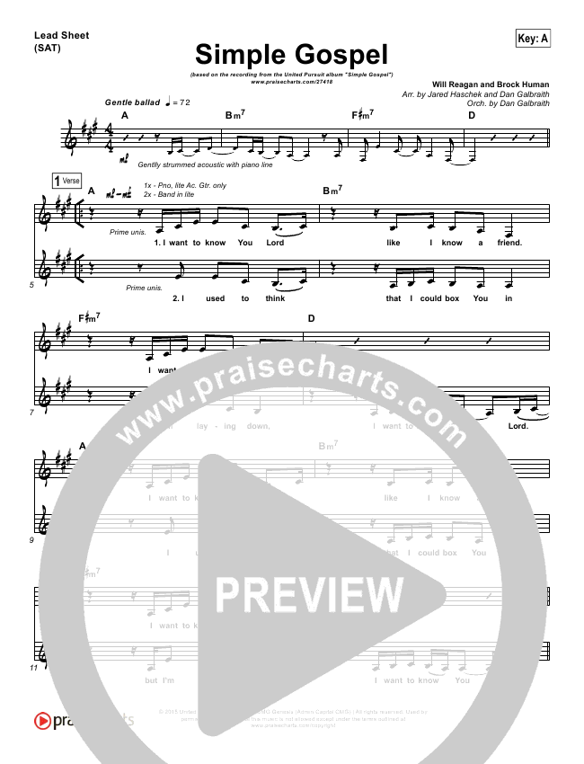 Simple Gospel Lead Sheet Piano Vocal United Pursuit Praisecharts